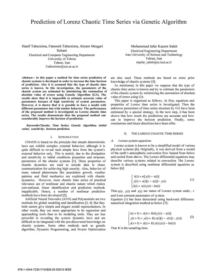 In this paper a method for time series prediction of chaotic systems is developed in order to increase the time horizon of prediction. Also it is assumed that the type of chaotic time series is known. In this investigation, the parameters of the chaotic system are estimated by minimizing the summation of absolute value of errors using Genetic Algorithm (GA). The results show that it is impossible to estimate accurate value of parameters because of high sensitivity of system parameters. However, it is shown that it is possible to have a model with different parameters but with similar behavior. The performance of the proposed method is investigated on Lorenz chaotic time series. The results demonstrate that the proposed method can considerably improve the horizon of prediction.